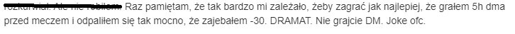 A w sumie, jesli byles w stanie takie cos wyrwac z kontekstu to nie ma co gadac. Rutynowo gram DM codziennie wliczajac w to wolne dni od X lat!