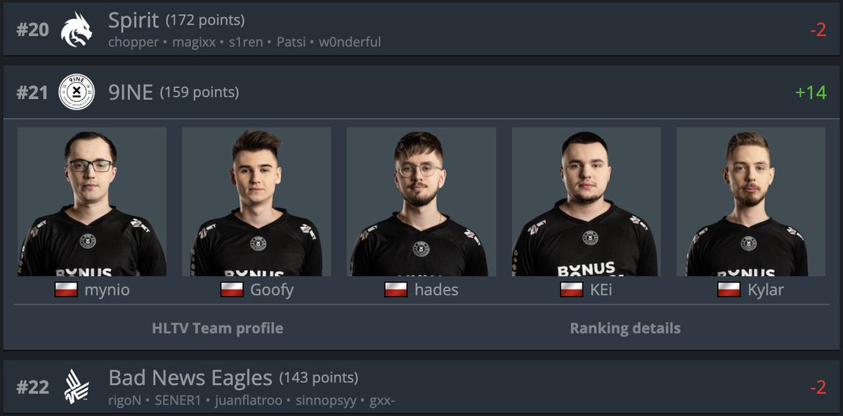 9INE just reached #21 on HLTV's World Rankings. The last time a Polish team was this high-ranked, it was the legendary Virtus Pro lineup in its dying breaths, almost four years ago