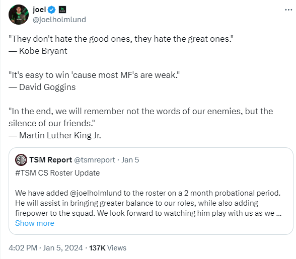 Wow, Joel znowu uwikłany w coś nieetycznego. Kto mógł się tego spodziewać. Przypomnijmy, że porównał się do Kobe Bryanta, Davida Gogginsa i Martina Luthera Kinga, gdy dostał szansę dołączenia do TSM po odbanowaniu przez ESIC. Trudno pojąć ten poziom błazenady.
