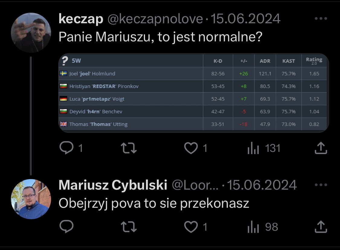 to drużyna niezle byla zapatrzona w niego, ze nie podejrzewali go o cheatowanie, nawet porównując statystki mozna bylo to wywnioskować jak po banie za fixowanie zacxal grac jak bóg, czy uczestniczysz w meczach nie wiem ale watpie, ze nawwt Ci gry na discordzie nie udostępniali