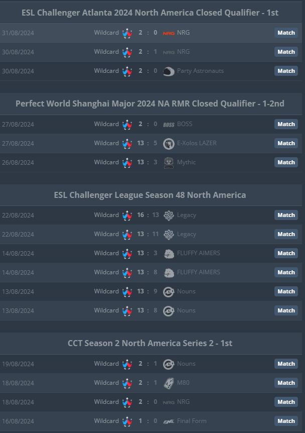 Signing phzy and susp really did the trick for Wildcard didn't it? Won an Online CCT tournament 14-2 in ESL Challenger NA 3-0 at the Closed Qual RMR Qualified for ESL Challenger Atlanta 2024 Won 28 out of 34 maps in August and 11/12 Bo3s since the transfers happened.