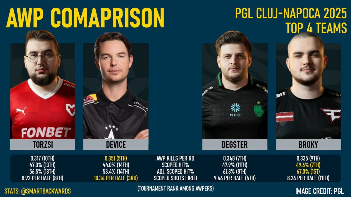 AWPer comparison for the remaining PGL teams broky has been the most accurate sniper of the tournament when adjusting for random smoke spams both dev1ce and degster are "volume shooters" (partially due to the MIBR OTs) will be some interesting CS to watch today!