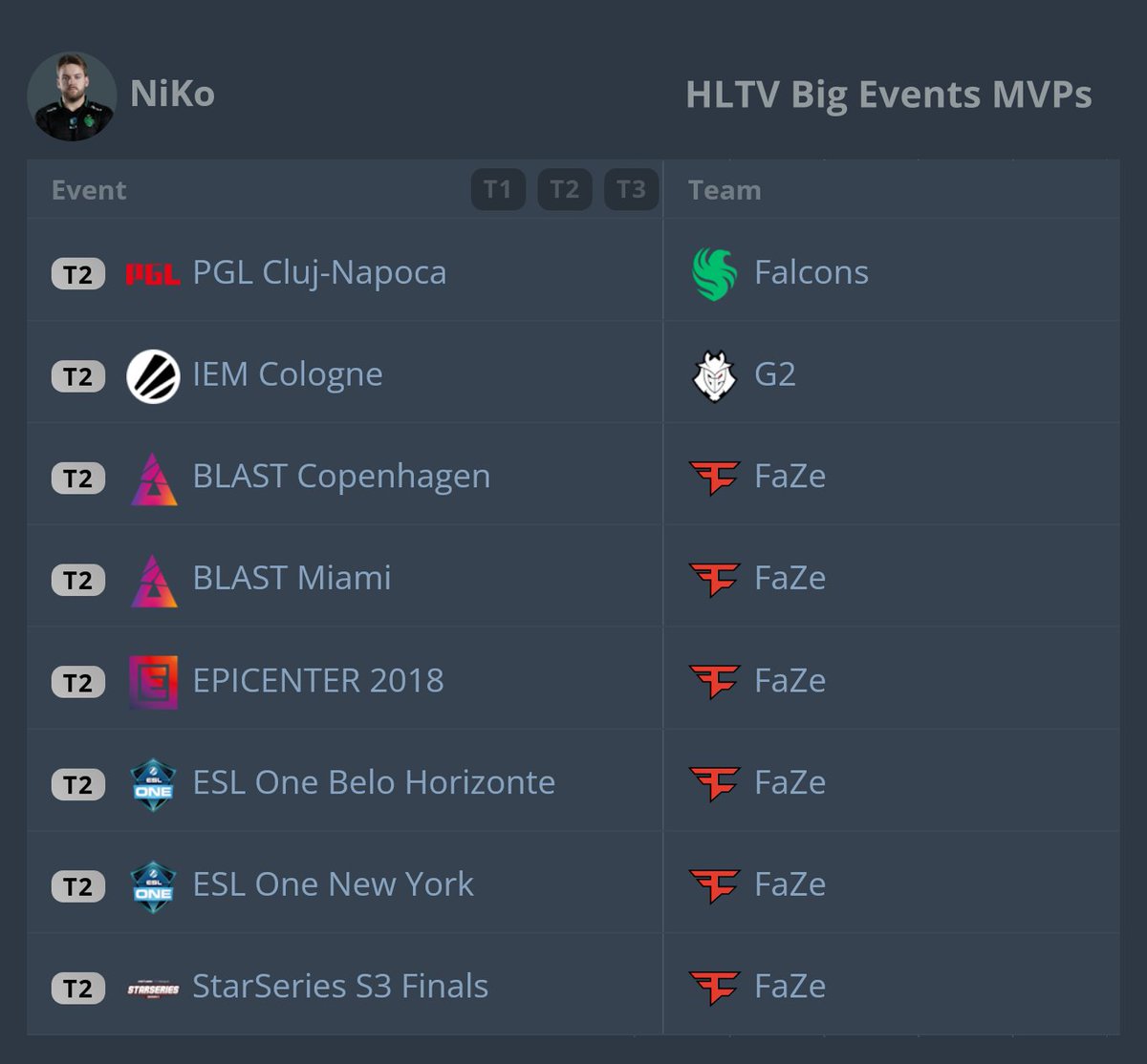 NiKo jest jedynym graczem, który zdobył MVP dużego turnieju w 3 różnych drużynach