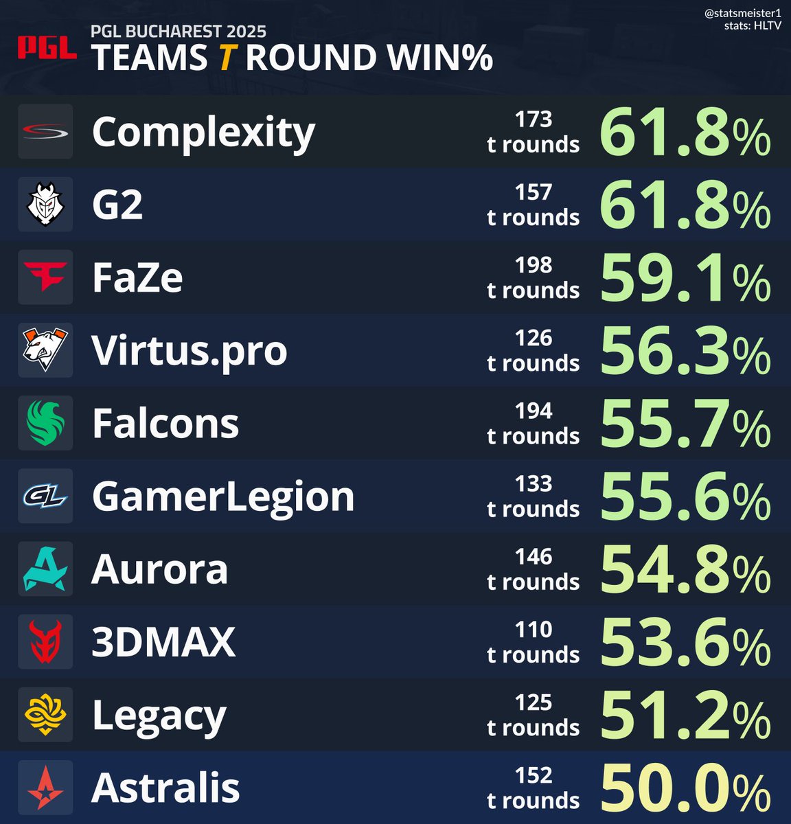 Top teams in T-side round win rate from the PGL Bucharest 2025