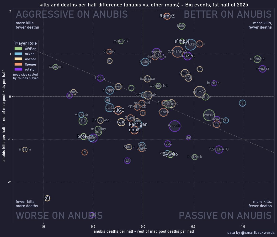 taking a look at the players which will benefit the most/least from anubis going out 🇺🇦b1t was the 3rd lowest rated anubis players this year, with a 0.76 in 6 maps 🇮🇱 flameZ was on the complete opposite of the spectrum - 2nd highest rated (1.35, same as donk) anubis was 🇺🇦s1mple's best map (higher rated on inferno but only 1 of them played), and 🇱🇻 broky's 2nd worst map in terms of rating - 0.91 (lowest was mirage with 0.88) troubles for🐴Liquid - anubis was their first pick and their only map with a positive win rate scatterplot with all the players in reply!