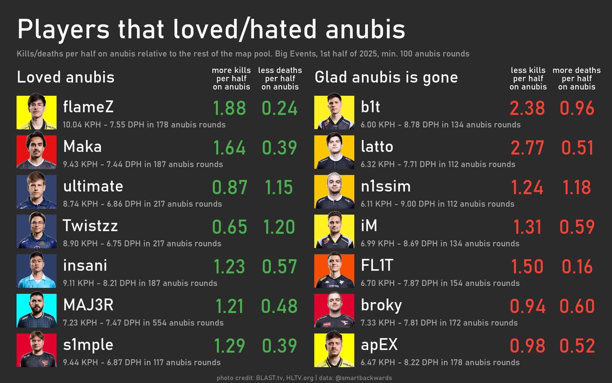 frozen is the only remaining FaZe player to have overperformed his regular numbers - EliGE, rain, karrigan and broky all noted drops both donk and ZywOo got almost less than a full kill per half on anubis compared to the other maps. 🇷🇺m0NESY was the highest rated anubis player, but anubis was Falcons' first ban, so he only played half a season on it Mzinho was practically tied with apEX in terms of underperformacne - wasn't a great map for The MongolZ chart shows just how much b1t has underperformed his usual stats let me know if you're alright with the flags or if it makes reading these worse
