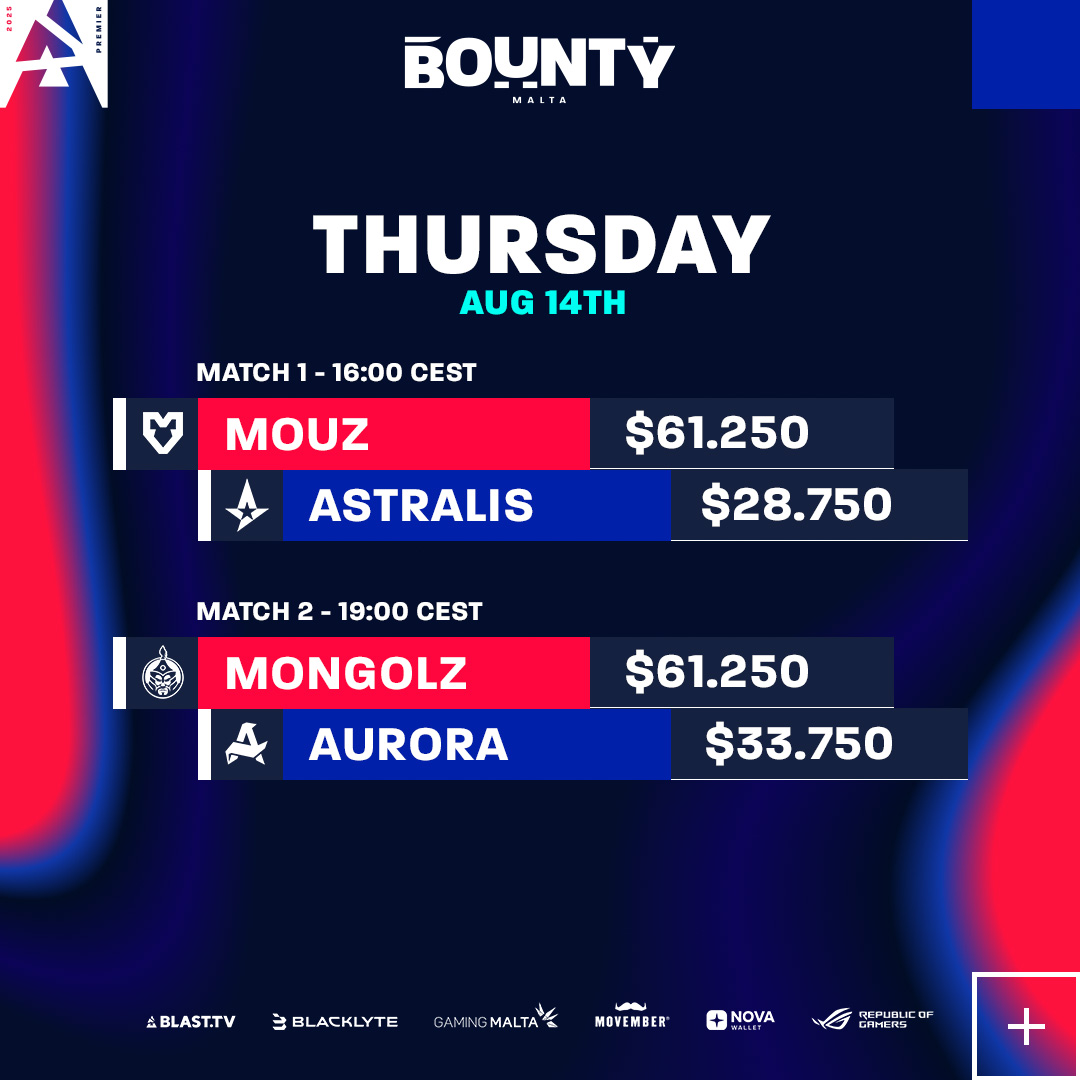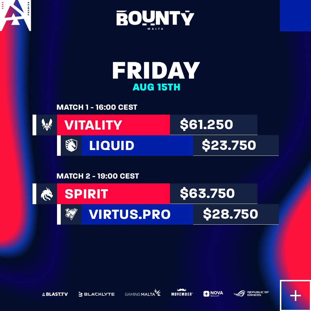 Nasze ćwierćfinałowe pojedynki są ustalone na Bounty ✅💰 Oglądaj nas na żywo jutro od 15:30 CEST, gdy po raz pierwszy powitamy fanów w naszym maltańskim studiu! #BLASTPremier