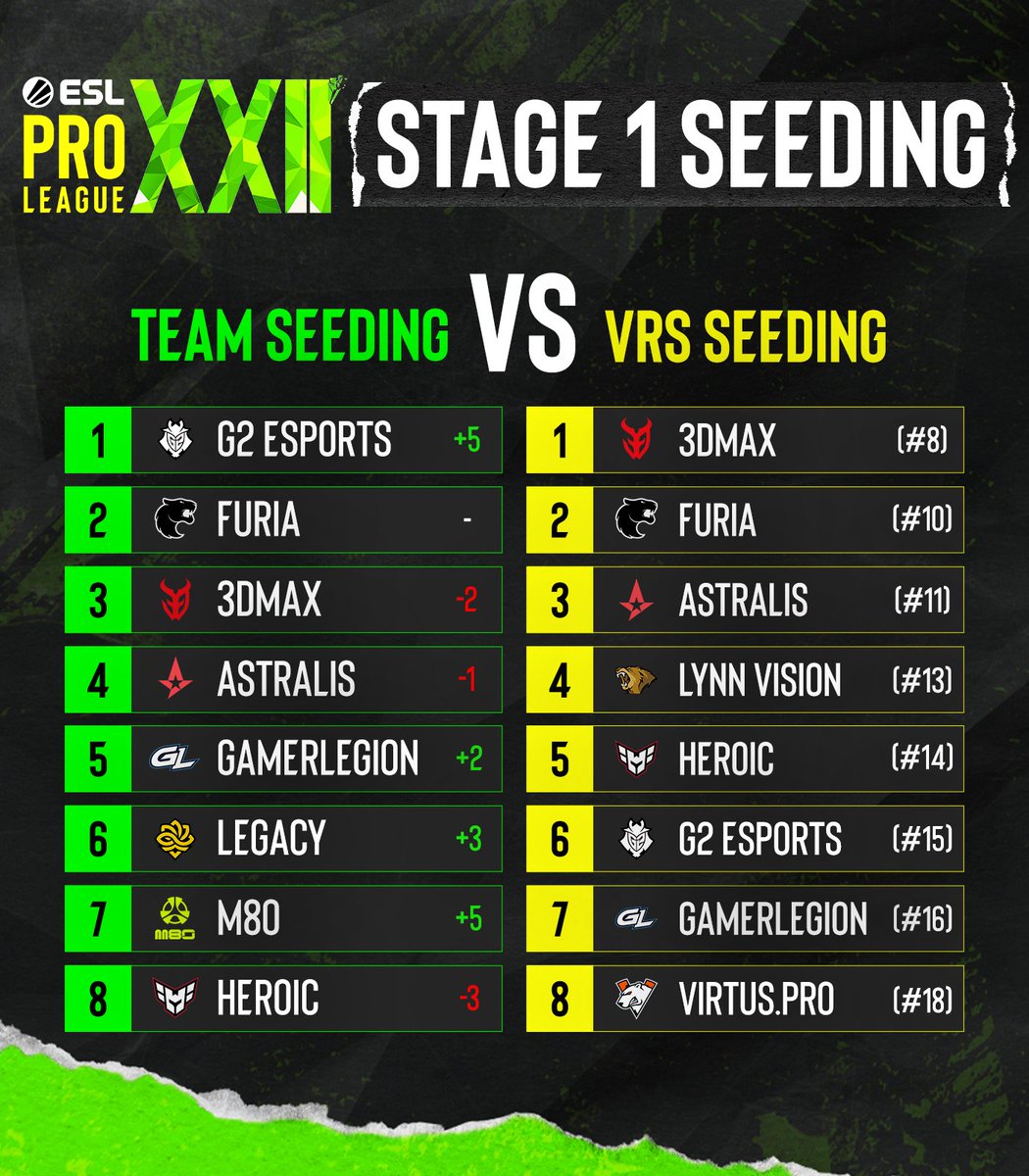 +5 RANKS FOR @G2CSGO 📈 As we head into Stage 1 of #ESLProLeague S22 each team submitted a ranked list of the other 15 participants with final seeding determined by the average values. See the table below to compare this seeding to Valve's VRS!