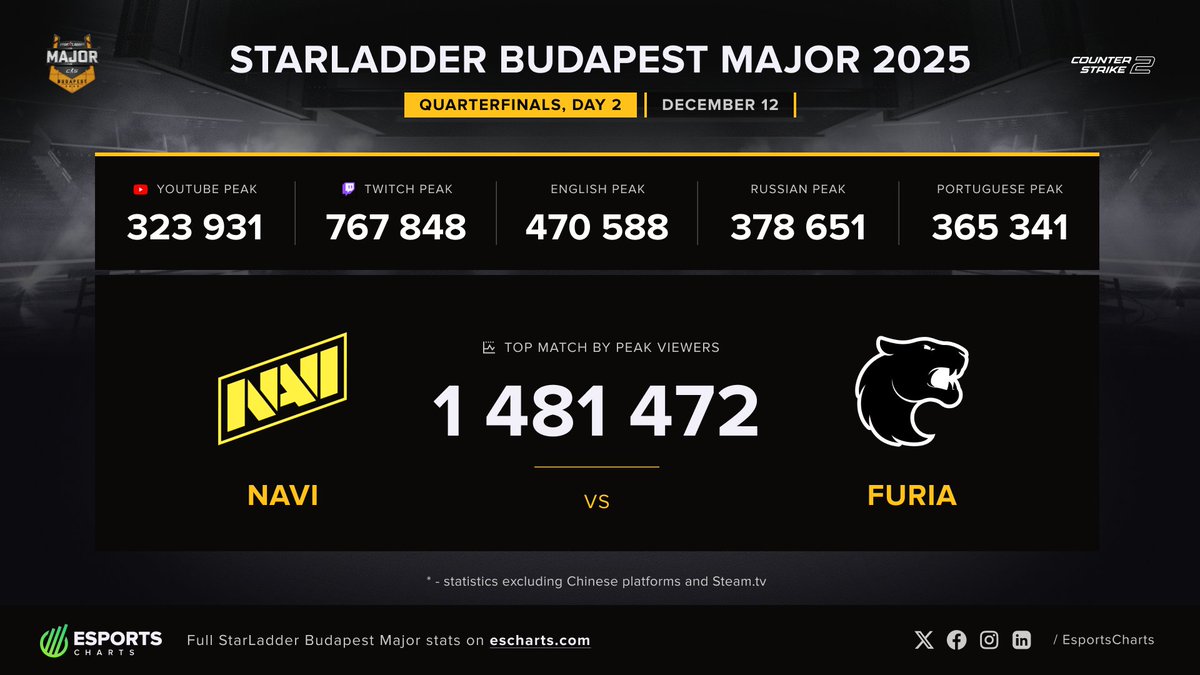 New peak for #BudapestMajor in 2nd day of quarterfinals. TOP match of the day @natusvincere vs @FURIA. 🔥1.4M Peak Viewers TOP-5 matches of event👇 https://t.co/84YKUiAnhB