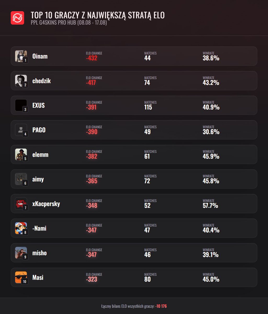 Dzięki @PolishProLiga PRO HUB polska scena jest lżejsza o ponad 10K elo 😎 Oto lista największych spadkowiczów #1 @maniox16 #2 @Ch3Dz1k #3 @exusinn #4 @PagowskiMateusz #5 @elemmcs #6 @aimyisu #7 @XKacpersky #8 @Namixpp #9 @mishoCS2 #10 @Masi_cs2